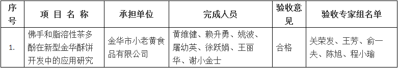 根據(jù)《金華市級科技計劃項目驗收管理辦法》(金市科字〔2015〕83號)規(guī)定,現(xiàn)將金華市小老黃食品有限公司承擔的《佛手和脂溶性茶多酚在新型金華酥餅開發(fā)中的應用研究》市級科技計劃項目驗收結(jié)果予以公示,接受社會監(jiān)督,公示期從2018年8月21日至2018年8月28日止。任何單位和個人對驗收意見持有異議的,應當在公示期內(nèi)書面向市科技局提出異議,單位應采用書面形式并加蓋公章,個人應采用實名提出異議。