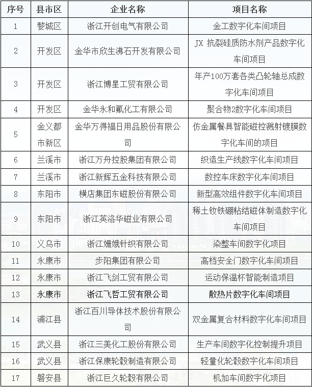 2018年金華市“數(shù)字化車(chē)間”示范項(xiàng)目名單