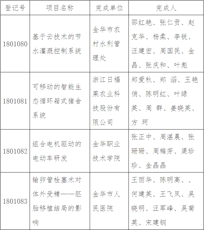 根據(jù)《金華市科技成果登記管理辦法》(金市科字〔2009〕6號(hào))文件相關(guān)規(guī)定,在各縣(市、區(qū))科技局和金華經(jīng)濟(jì)技術(shù)開(kāi)發(fā)區(qū)高新產(chǎn)業(yè)局推薦的基礎(chǔ)上,經(jīng)審查,現(xiàn)予以公示辦理登記的成果,接受社會(huì)監(jiān)督。公示期7天,如有異議,請(qǐng)于公示之日起至2018年12月6日來(lái)人或來(lái)電反映。聯(lián)系電話:82468069,82050167。郵編:321017。