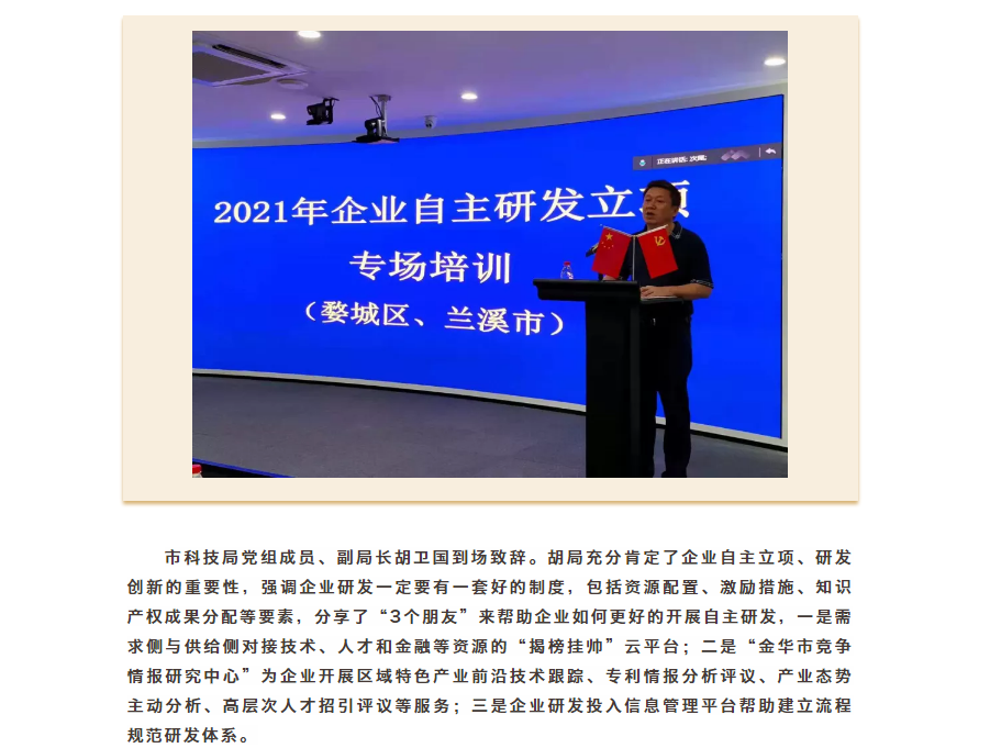 首頁 >新聞中心2021年企業(yè)自主研發(fā)立項專場培訓(婺城區(qū)、蘭溪市專場)順利召開